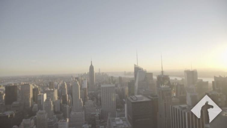 An open view over Manhattan, New York, with a helicopter passing through. |