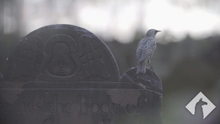 A close shot of a bird flying away from a gravestone in Manhattan, New York. |