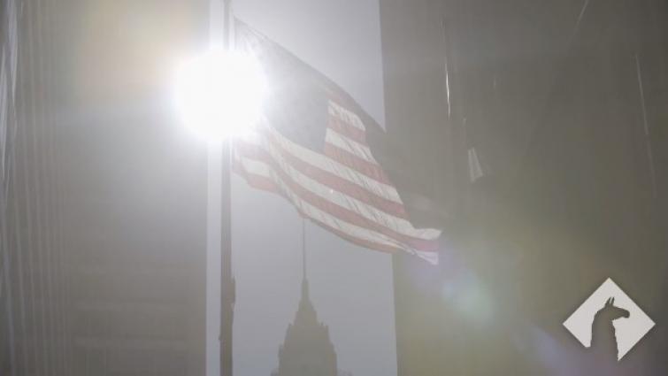 A shot of a waving USA flag closely in front of the blowing sun in Manhattan, New York. |