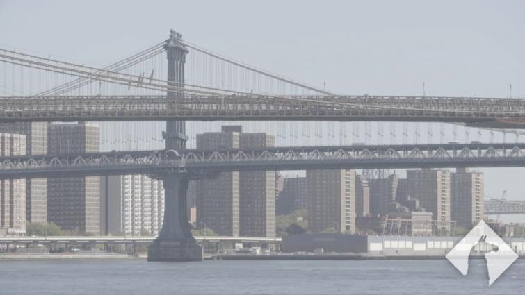 A sequence of a driving through watertaxi in front of Brooklyn Bridge in Manhattan, New York. |