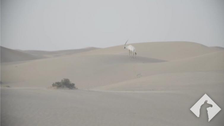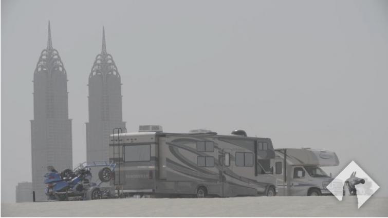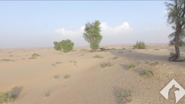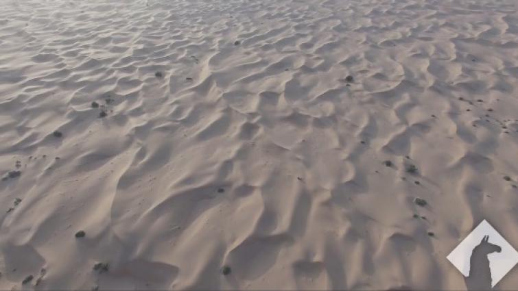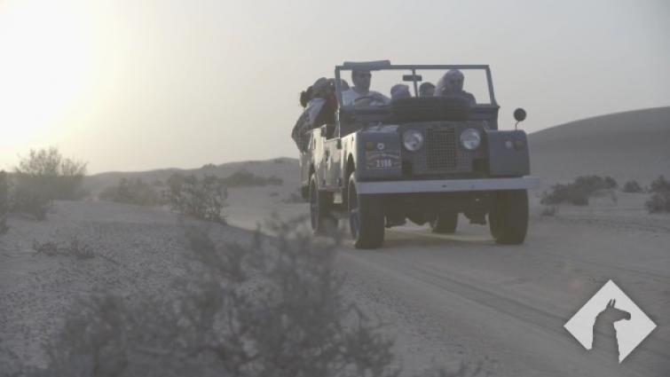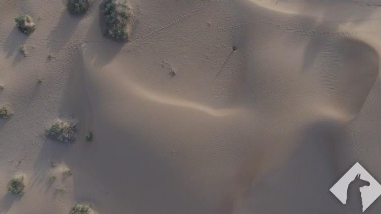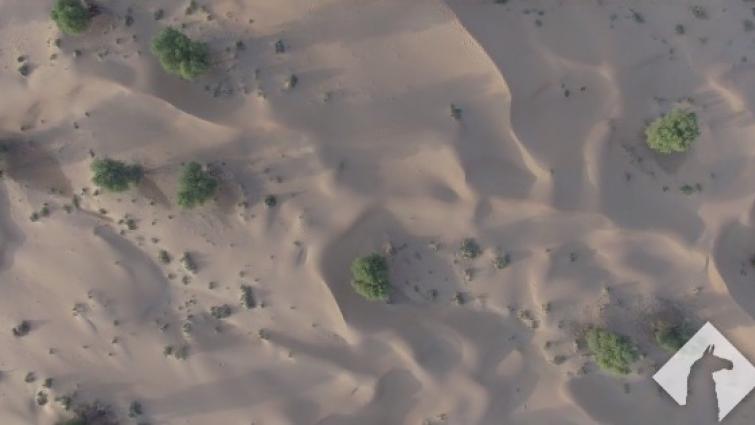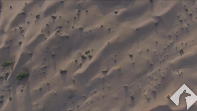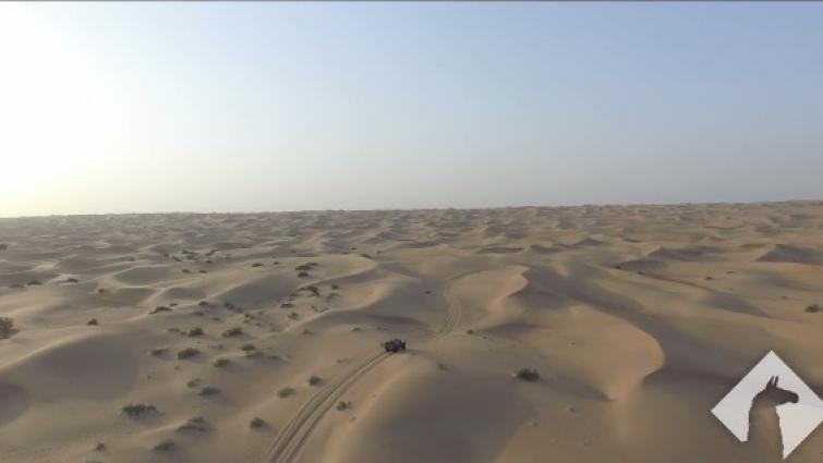 A topshot aerial of two Jeeps driving through the desert dunes of Dubai. |