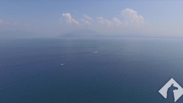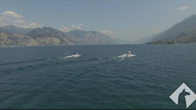 A droneshot of an island at Lake Garda in Italy with some boats passing by. |