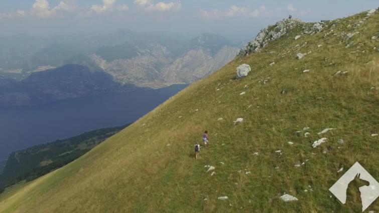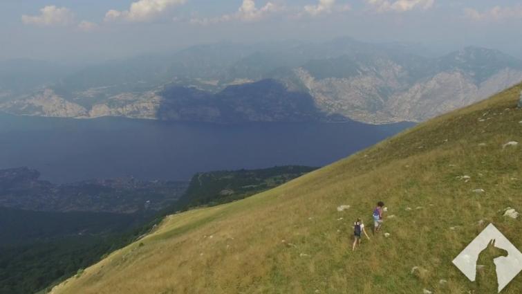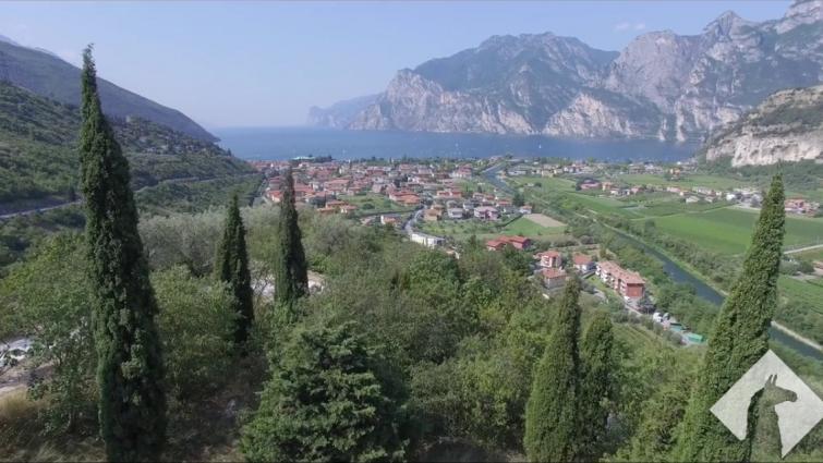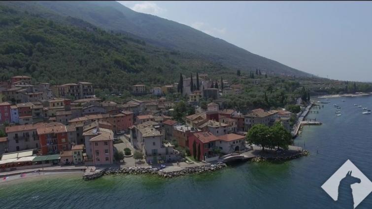A high drone shot above sunny Lake Garda in Italy. |