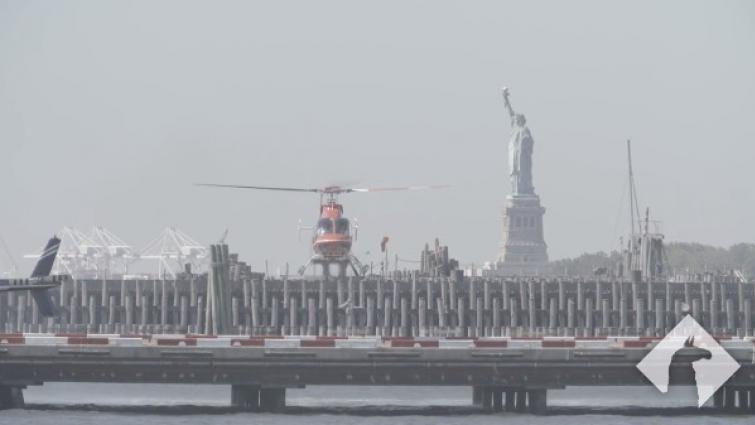 A helicopter landing sequence with an open view on Lady Liberty in Manhattan, New York.