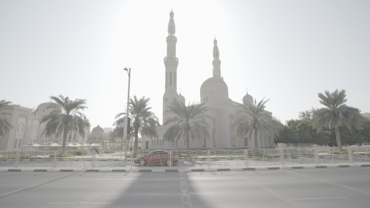 Dubai day mosque car beatle sunset |