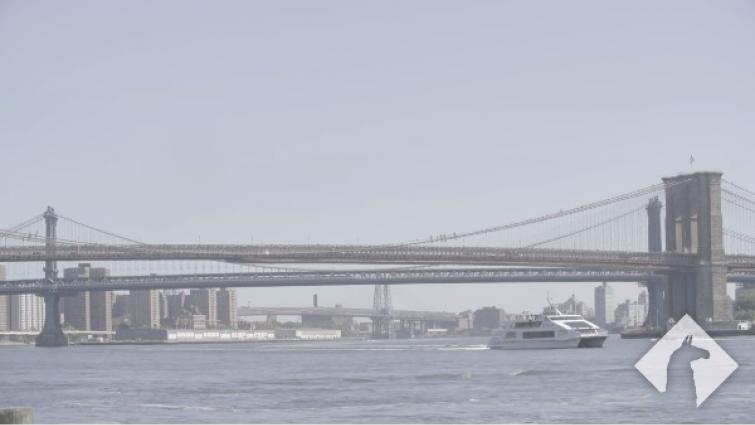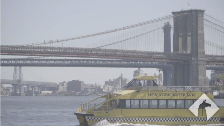A sequence of a driving through watertaxi in front of Brooklyn Bridge in Manhattan, New York.