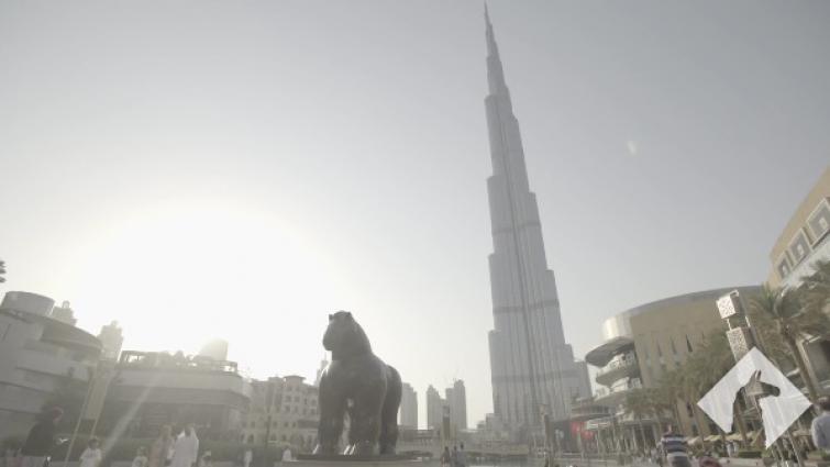 This a open shot of the Burj Khalifa and the Dubai Mall |