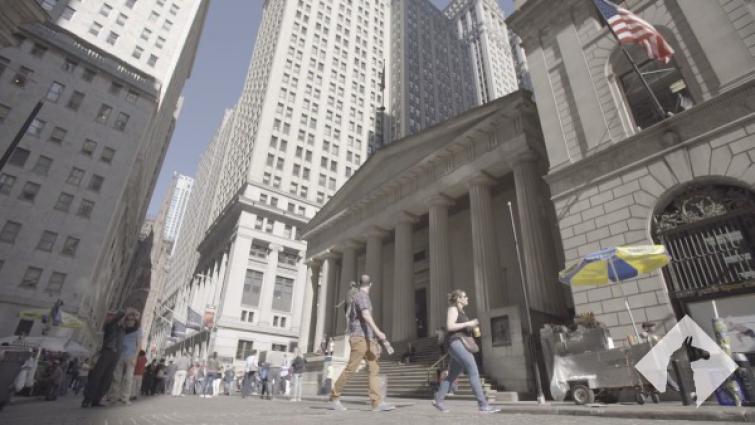 An open low angle slider shot of people walking through the wallstreet district in Manhattan, New York. |