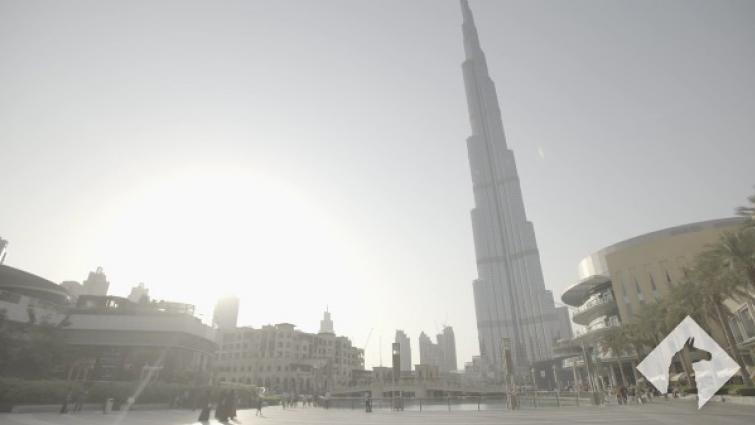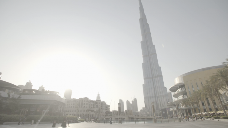This a open shot of the Burj Khalifa and the Dubai Mall |